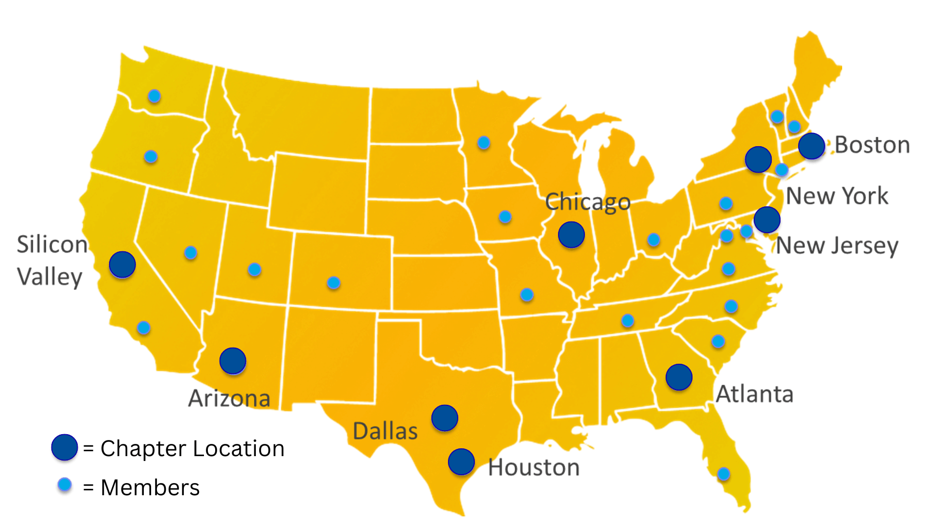 With nearly 300 members and nine chapters – Arizona, Atlanta, Boston, Chicago, Dallas, Houston, New Jersey, New York, and Silicon Valley – plus members in many other locations throughout the country and internationally, we have a vibrant nationwide network. All members belong to our national organization and may participate in any and all events throughout the country.